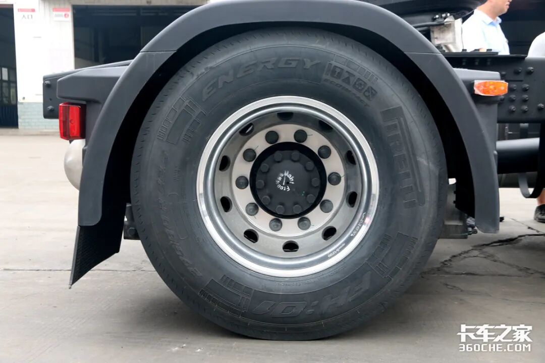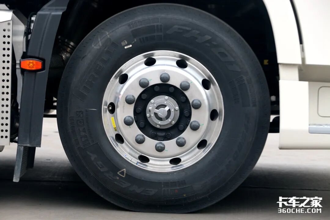 在轮胎方面,GX全车均使用了倍耐力FH-01系列的轮胎,尺寸为295/80 R22.5,这款轮胎价格不菲,主打高速运输,看得出来东风对这台GX下了不少功夫。前后均使用了铝合金车轮,有效降低了整车重量,并且均使用了康迈免维护轮端,前桥的可视窗设计能够让卡友实时观察轮端中的油液状态。同时GX还配备了防爆胎应急装置