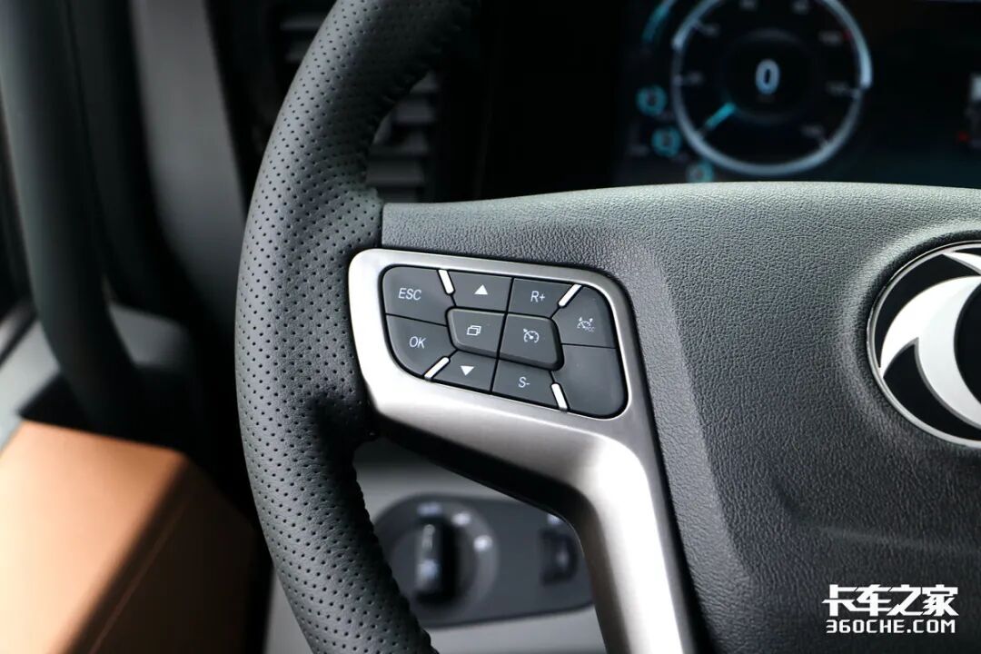 方向盘的调节角度非常宽泛,可以应对各种身材的卡友进行驾驶。此外,在多功能按键上也有着一定的区别,左侧按键可以控制PCC高清地图预见性巡航,打开后可以根据卫星地图显示的坡度、道路,对车辆的车速实现实时控制。什么时候该踩油门、什么时候该冲破,PCC系统通过提前计算都可预知,你只需要握紧方向盘即可。