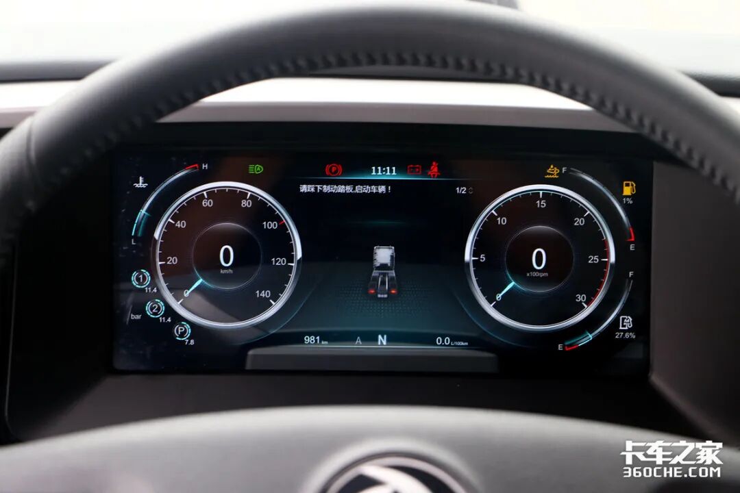 要说内饰升级最为彻底的区域,就是GX使用了全液晶的仪表盘,左侧为水温、转速、气量的显示,右侧是油量、尿素量、转速的显示,分配比较均衡。中间的牵引车图标可以随着车辆状态进行改变,可以说这款仪表盘不仅清晰易读,而且在界面设计和使用逻辑上也非常流畅。