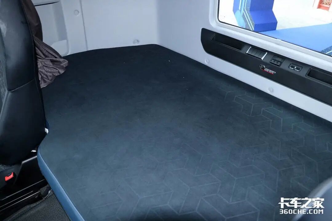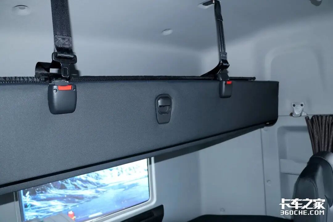 在生活区域,车辆配有平地板+双卧铺,其中上卧铺支持小角度折叠,在驾驶室内直立不碍事。同时得益于驾驶室更大的外凸设计,下卧铺宽度达到了1.01m,且也能为卡友提供舒适宽敞的休息空间。