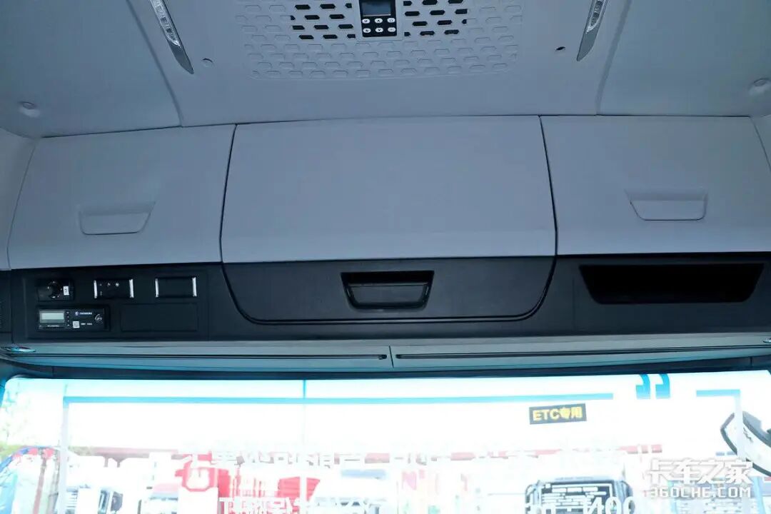 在储物空间方面,实拍车在中控岛台位置设计有双层多个开放式储物空间,这也是欧曼重卡的传统匹配了。此外整车最大的储物空间当属驾驶室顶置储物格了,也可满足卡友日常储物需求。
