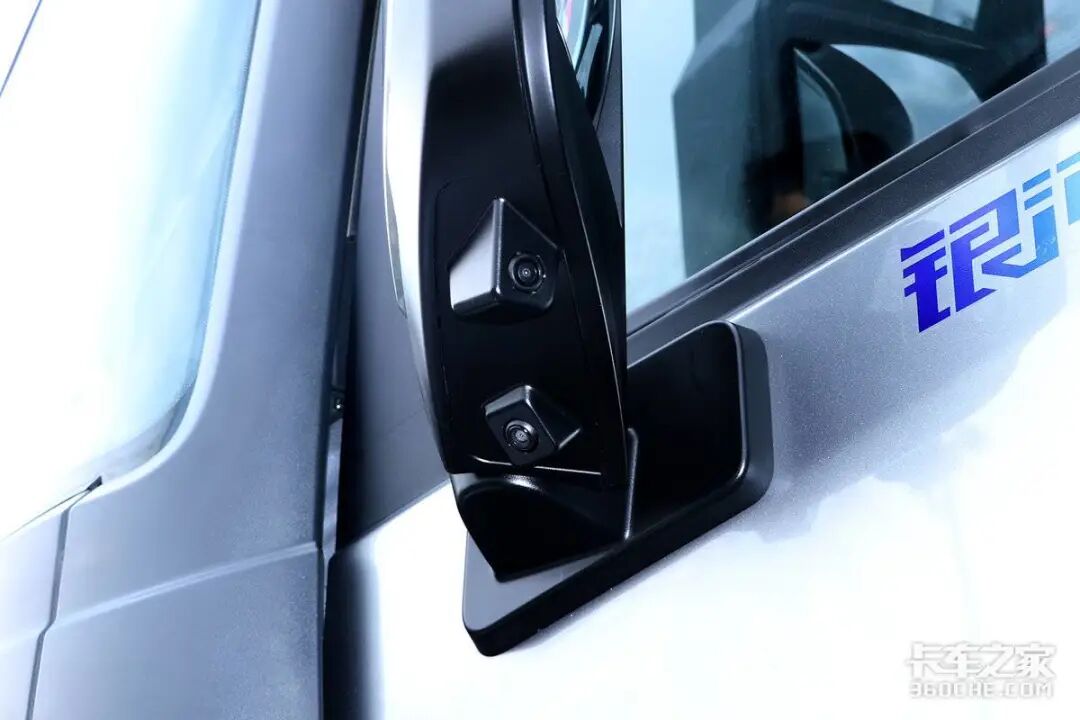 此外在后视镜底座位置,还集成有360°环景影像摄像头,可以实现左右两侧、前部盲区的实时监控。且在提升行车安全性方面,该车辆除带有防碰撞、车道偏离预警外,还可适配更高阶的AEBS、ACC、LKA车道自动保持等辅助驾驶匹配。