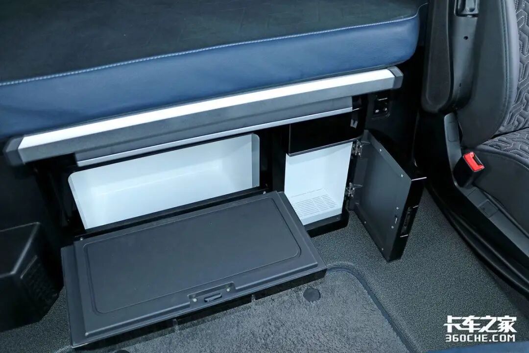 或许您可能要问了,卧铺底下没有空间了吗?别急,实拍车在卧铺底部直接给咱们配了一台双开门车载冰箱,支持冷冻、保鲜功能,也方便咱们卡友长途行车存放一些蔬菜水果,以及冷冻肉类、速冻食品等,且在旁边也配有220V车载电源。