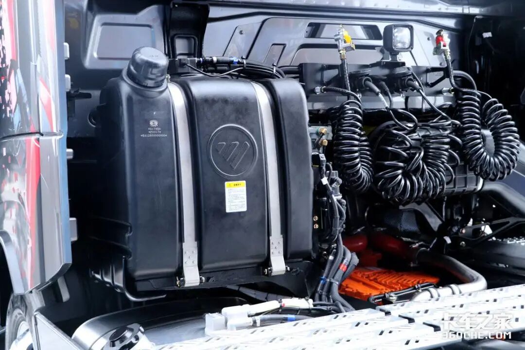 此外为了进一步提高车辆运营效率,实拍车适配有850L+350L双加热油箱,能够为整车提供极为长远的续航里程。并且为了满足大油箱、长续航的匹配要求,整车进行轴距加长,达到了3450+1350mm,并且尿素罐上置设计,均为大油箱的匹配提供了空间。