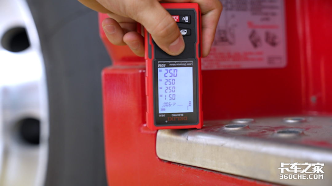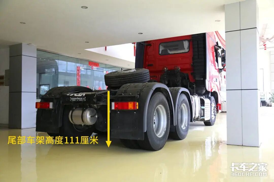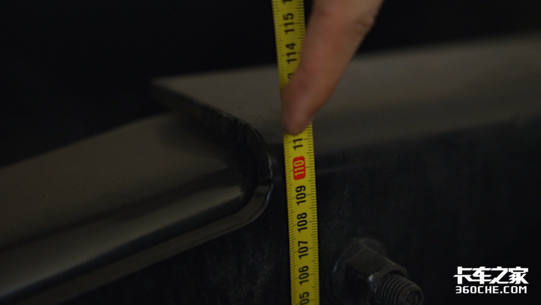 车外的第四项测试就是整车的后车架高度,实拍东东风天龙旗舰KX经典版采用钢板悬架设计,后车架高度为固定高度,经过实测其高度为111厘米。当然根据资料显示,东风天龙KX旗舰经典版还可以选装低鞍座以及空气悬架,可以适应不同高度的挂车。