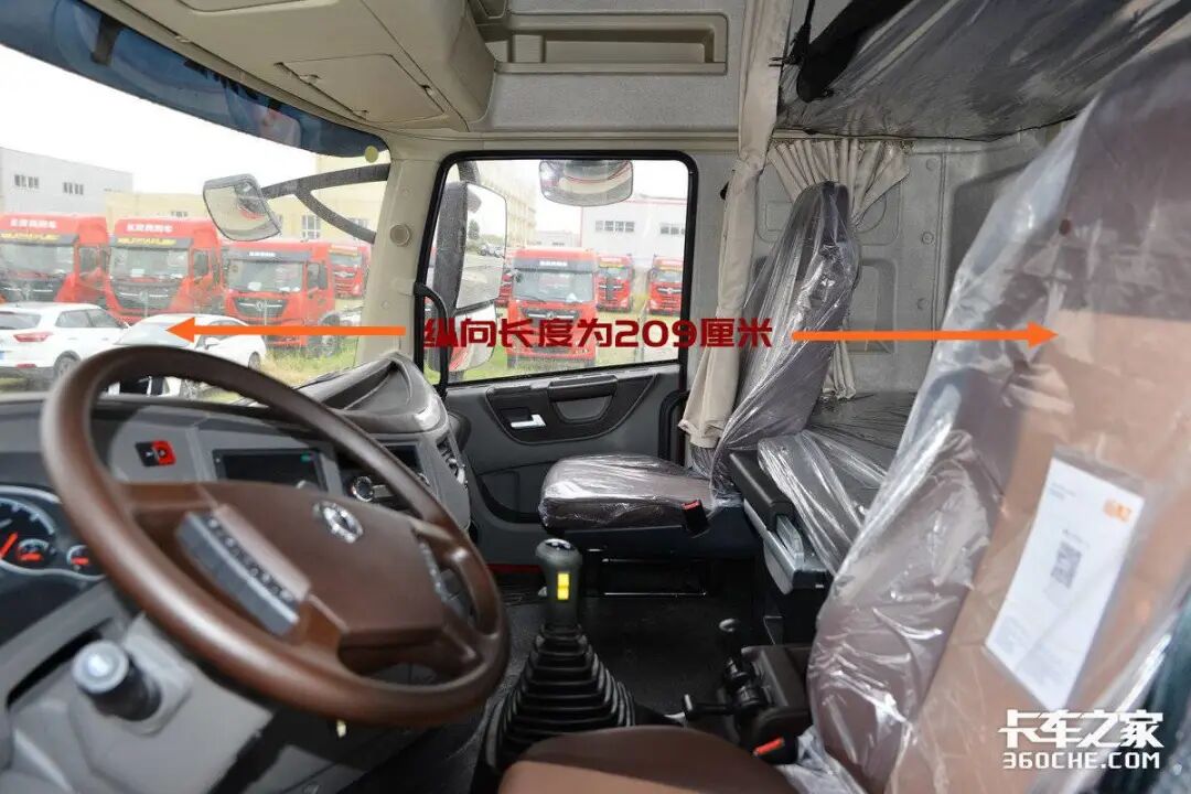 而在纵向长度方面,从挡风玻璃中间至卧铺后窗的距离为209厘米,我们可以粗略计算出,东风天龙旗舰KX经典版的驾驶室内部空间在4平米左右。