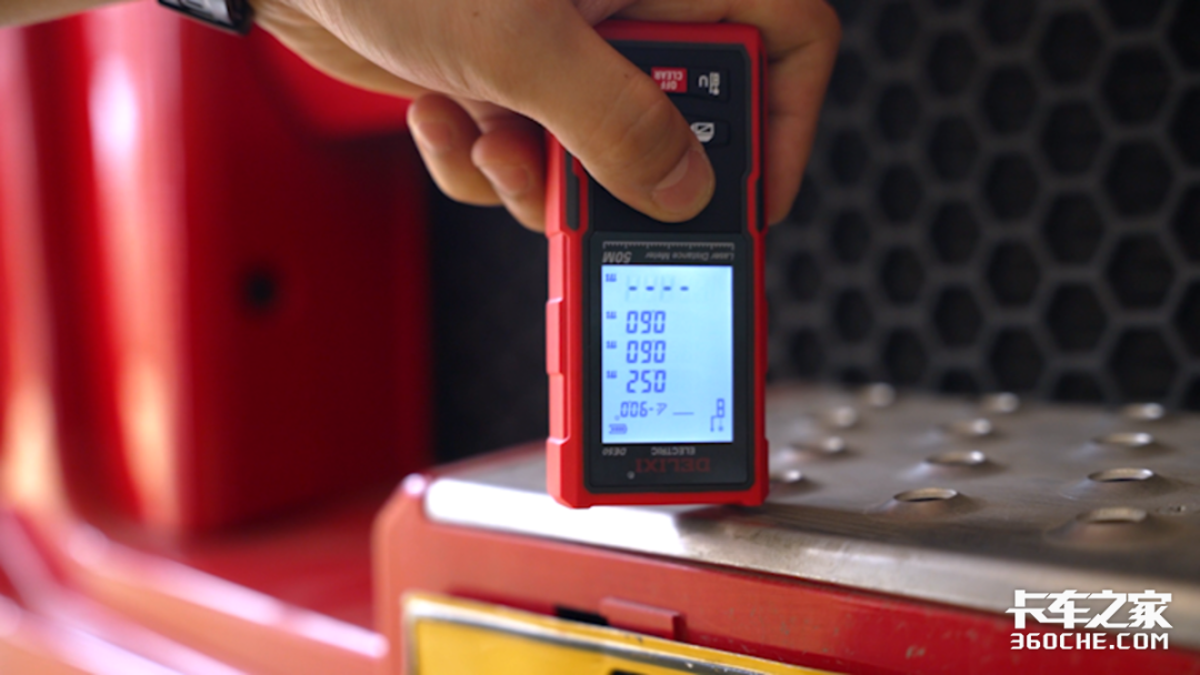 第三项测试则是卡友们非常熟悉的工作台区域,在这个区域内卡友需要接驳挂车以及加注尿素、拿取挂车装备等行为,所以工作台的大小、便捷性将会直接影响到卡友的实际使用体验。经过测算,东风天龙KX旗舰经典版的工作台长度为85厘米,宽度为45厘米。