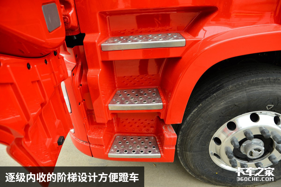 经过三位不同身高编辑实际体验而言,52厘米的高度配合上逐级内收的踏板设计,175厘米以上的卡友上下车都能较为轻松,而52厘米的高度在主流牵引车当中属于居中水平,而一部分身高不超170厘米的卡友,上下车相对吃力一些。这里需要注意的是较矮的踏板高度虽然可以方便上下车,但是对于路况的要求则更高。
