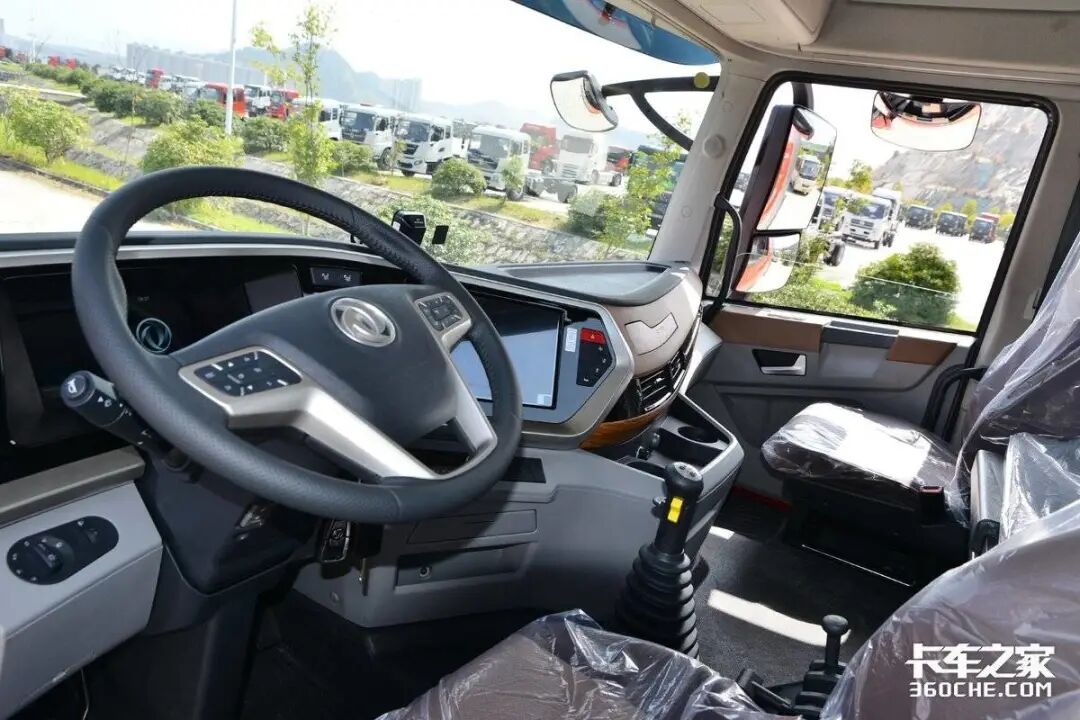 这款乘龙H7 LNG牵引车在舒适性方面也有出色表现,如驾驶舱的内饰全面升级,包括皮质包裹气囊座椅、液晶仪表、10.1寸触控大屏、全新皮革包裹多功能方向盘、全新升级天窗等。此外,还可选配220V电源、车载冰箱、360°全景影像、独立暖风、驻车空调等,可以说全方位的满足卡友们的用车需求。