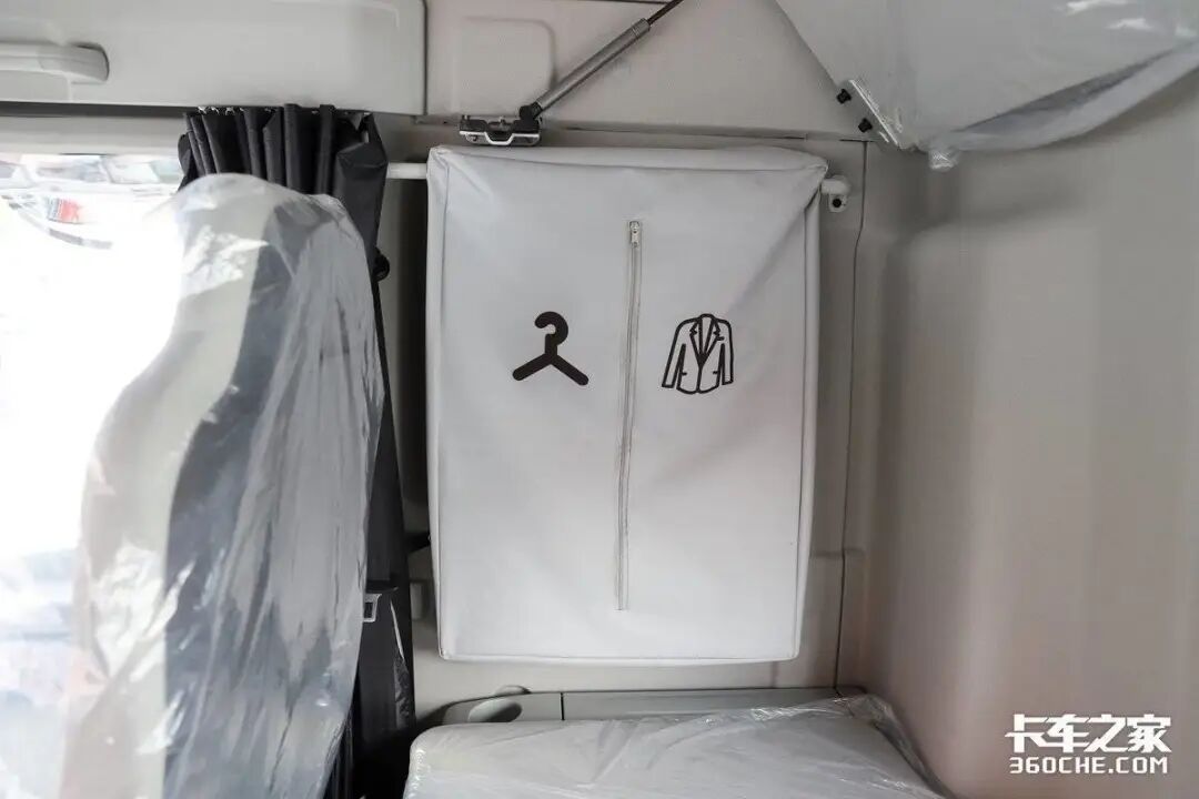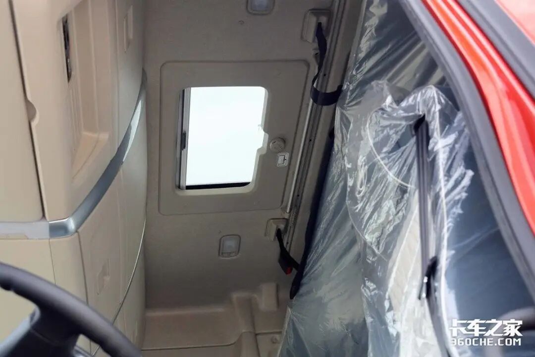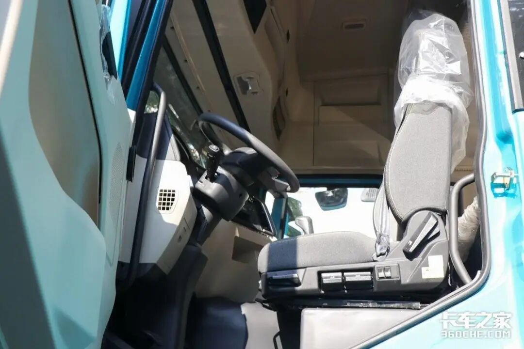 在驾驶室设计上,实拍车型的驾驶舱地板有一定的凸起,但并非传统的“大鼓包”,主副驾驶员可以方便地在驾驶室内完成更换。主驾驶座椅采用了多向调节的气囊减震座椅,带有腰背部支撑,对于需要长时间驾驶的卡友来说,这是一个非常友好的设计,可以缓解长时间驾驶带来的腰背疼痛。