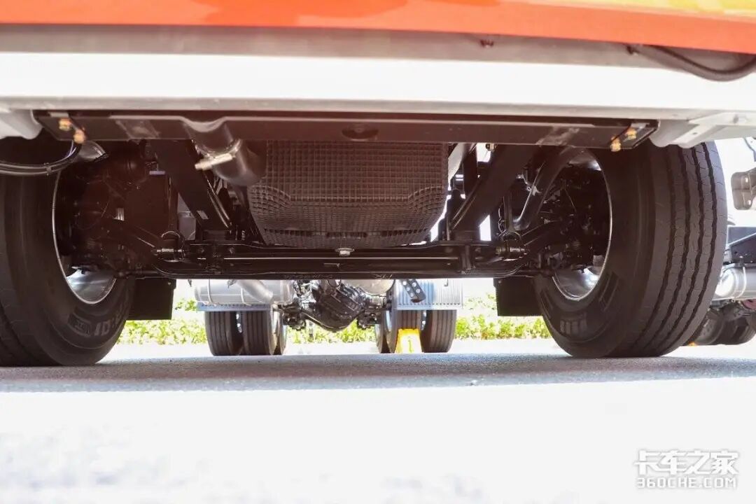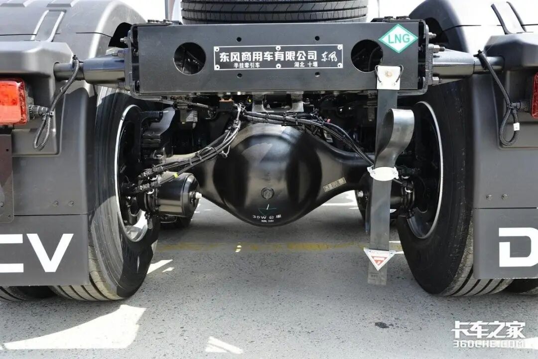 该车底盘采用前2后3少片簧设计,这是轻量化车型上比较主流的悬架结构,既满足了承载力,又降低了重量。后桥匹配东风德纳440车桥,速比为3.64。此外,它还配备了一个1350升的气瓶,相比于主流1000升气瓶,大容量的气瓶能提供更长的续航里程。