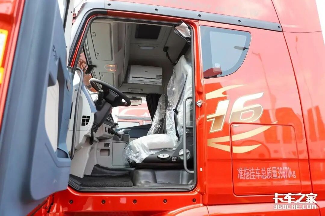 我们再看驾驶室,解放JH6的驾驶室地板突起高度在5-8公分左右,释放了驾驶员右侧的空间,使得驾驶员在车内活动、进出卧铺时更加轻松自如。主驾座椅采用了一体式安全带设计,并具有多级腰部支撑、坐垫倾角等调节功能,以及通风加热功能,提供了四季舒适的驾驶体验。