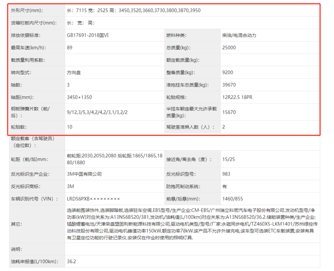 而在其他参数方面,通过公告中的信息我们可以得知,该车的外形尺寸为7115x2525x3450/3520/3660/3730/3800/3870/3950mm,轴距为3450+1350mm。公告总质量为25000kg,整车整备质量为9200kg。另外,整车轮胎规格为12R22.5 18PR。