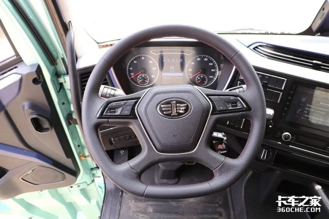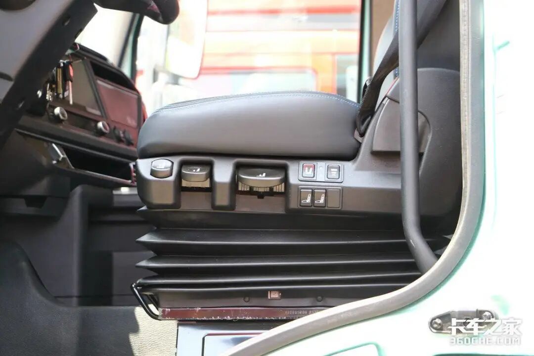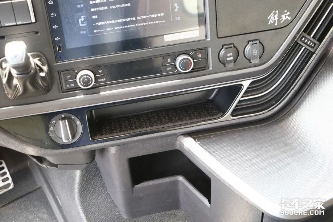 最后,在配置方面,这台解放J6V同样也是更加豪横,主驾配备有气囊减震座椅,并且带有一键充放、高度调节、阻尼调节以及腰部、背部单独调节,配合四点空气悬浮驾驶室,能够带来不错的驾乘舒适性。另外,像多功能方向盘、中控大屏、自动空调、正向碰撞预警系统等配置,这台解放J6V都有配备。