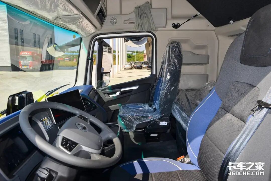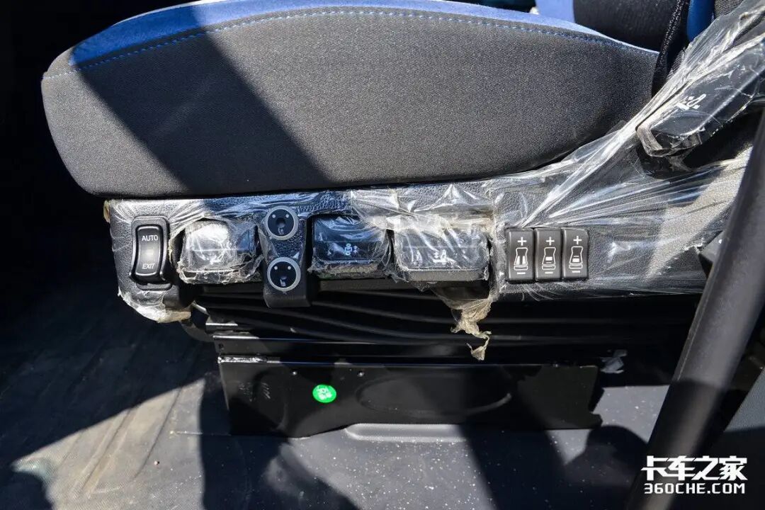 这台北京重卡追梦版采用高顶双卧平地板驾驶室,内部空间相当宽裕,此外驾驶室配置有四点空气悬置,在颠簸路段也能带来更平稳的体验,配合上带有腰托、背托、仰角调节等功能调节的通风加热气囊减震座椅,整体驾乘舒适性当属佼佼者的存在,能够有效降低卡友们长途驾驶的疲劳度。