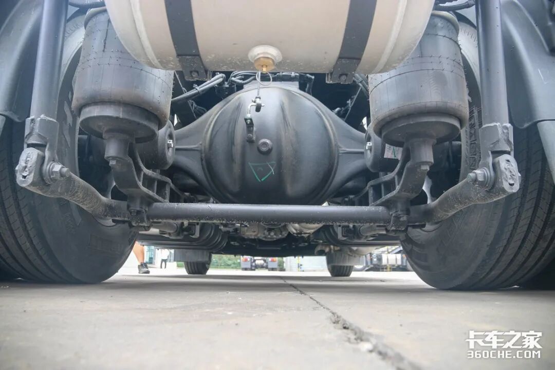 当然,一方面是为了轻,另一方面是为了更加符合高效运输的特征。这台天龙GX 4X2牵引车的后桥也采用了气囊悬架,4气囊结构。气囊悬架的好处除了本身可以实现快速的甩挂运输外,本身在对高价值货物运输时,能够更好的保护货物,尤其是运输精密仪器,电子设备等。当然,气囊悬架车型在对接货台时,也更加方便调整高度。缺点就是不太适合路况比较差的国道或者山路。