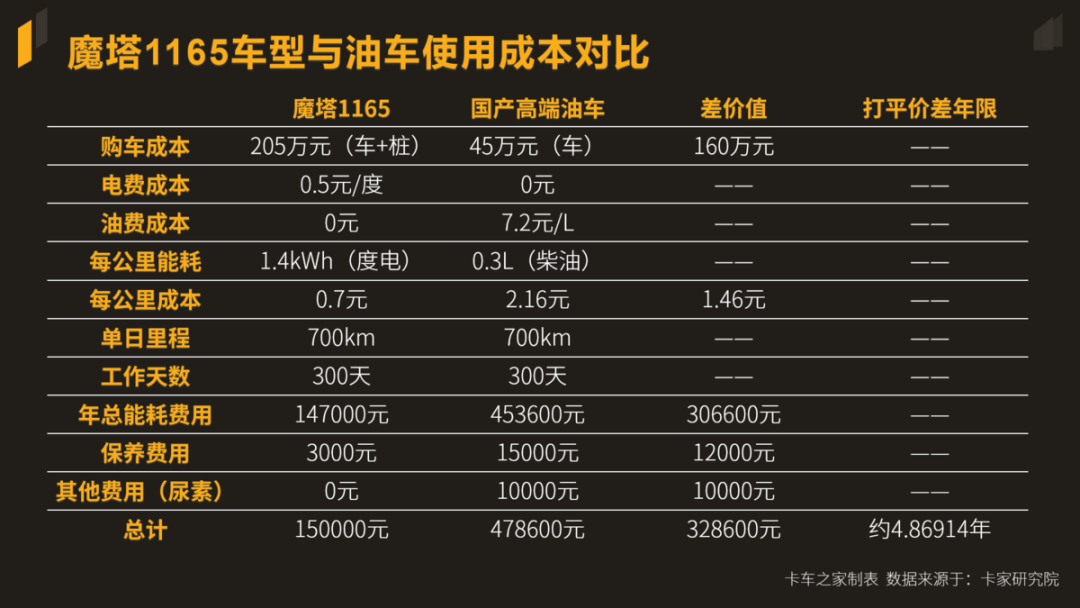 以刚才所计算的成本差距来看,每年差价32万元左右,想要摊平160万元的成本差距,那么我们就需要约4.869年,也就是将近5年的时间。换句话说,买了魔塔1165车型,在用到第五年的时候,我们的可以收回买车时多花的钱,后面就是净赚了。