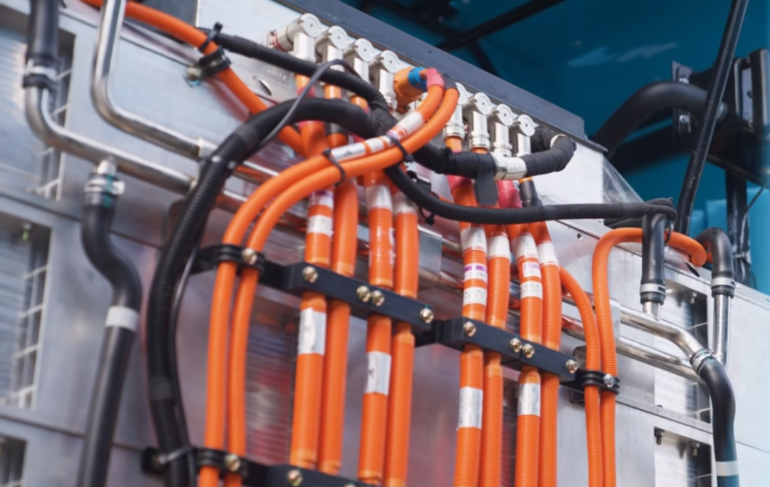如上图所示,传统的电池包共有电池包外壳、模组框架、电芯这三层设计。在这套架构中还要包含散热、加热、导线、监测传感器、信号线等等部件来保障电池包的正常工作。而在一些车,尤其是牵引车上,这样的电池包堆叠后在外面还会再加一个电池柜。