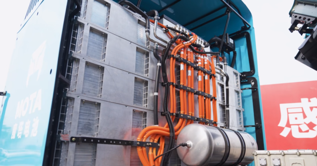 以魔塔1165为例,这款车上使用的魔塔电池组里,共计有超过1500颗大单体电芯。这些电芯之间有大量的分区监测点,实时监控电池的状态与温度。而在温度管理方面,三一重卡为魔塔1165的电池组配备了双8000瓦的双回路热管理机组。