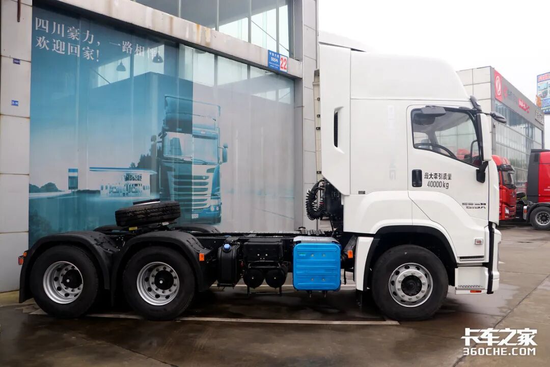 整车尺寸方面,这台五十铃巨咖的长宽高分别为6895X2540X3970mm,轴距为3385+1370mm,采用了高顶驾驶室设计,内部高度表现非常不错。而在自重方面,这台五十铃巨咖的整备质量为8.87吨左右,在6X4牵引车中,这样的身材算正常表现。