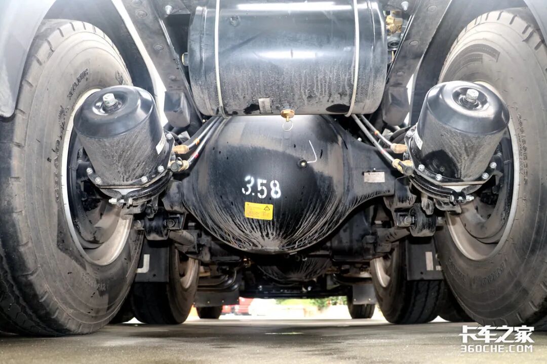 而在底盘的部分,这台巨咖采用了前2后4的板簧设计,后桥还采用了I型推力杆,防止车桥前后位移,在复杂路况下的耐用性较高。后桥速比为3.48,经过卡车之家车速计算器计算,在900-1300rpm的经济区间内,这台巨咖的最高车速为58-85km/h,平均车速不低。