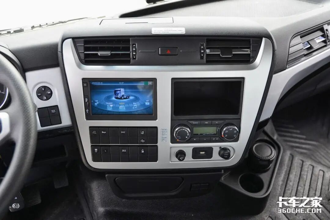 而中控台采用环绕式设计,卡友们可以非常方便的操作中控按键,还配备有一块中控大屏,支持语音控制、手机互联、音乐、行车记录仪、货车版导航、蓝牙等多种功能。