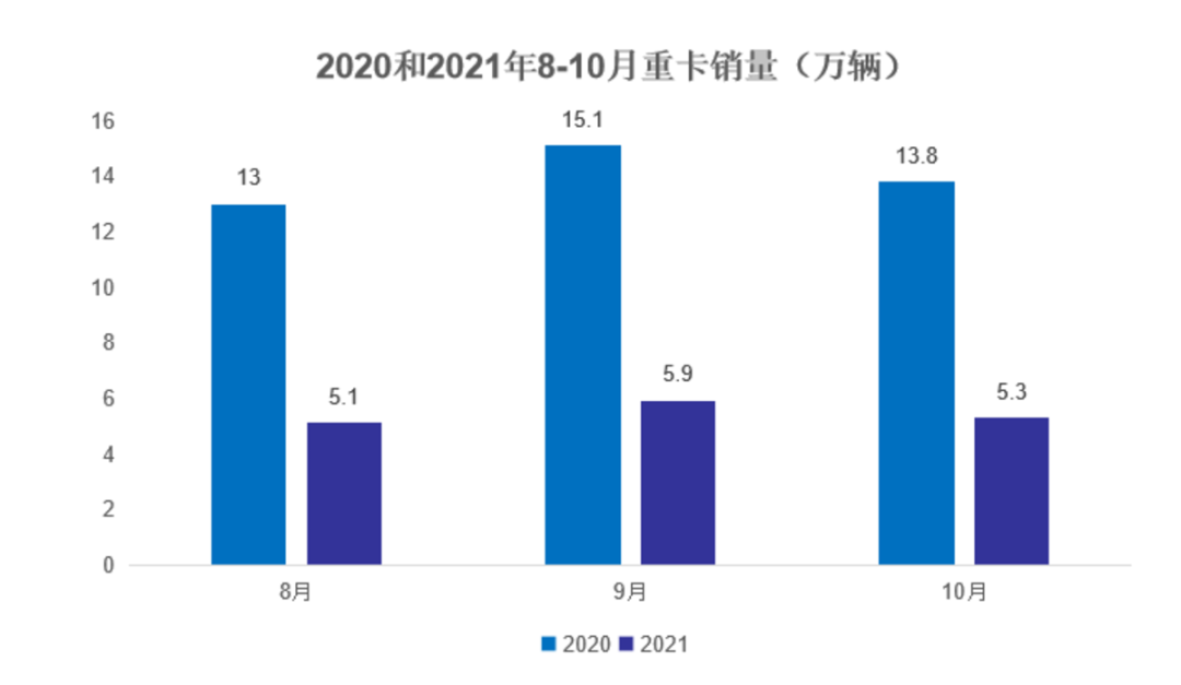 8月,重卡销售5.1万辆,同比下降60.5%;9月重卡销售5.9万辆,同比下降60.7%,10月重卡销售5.3万辆,同比下降62%。
