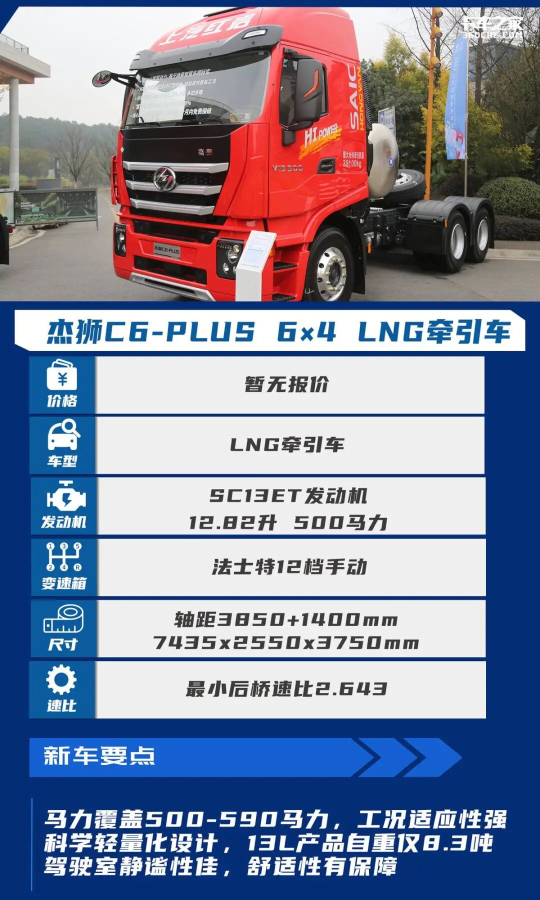 其中实拍的这款红岩杰狮C6-PLUS 6×4 LNG牵引车搭载了SC13ET燃气发动机,排量为12.82升,可输出500马力,最大扭矩2300牛米,可在1100-1500转时输出最大扭矩,满足国六排放标准。该发动机应用了当量燃烧+EGR+三元催化技术,并且设计有燃气连续流技术,可精确控制空燃比,提高了效率和动力性。