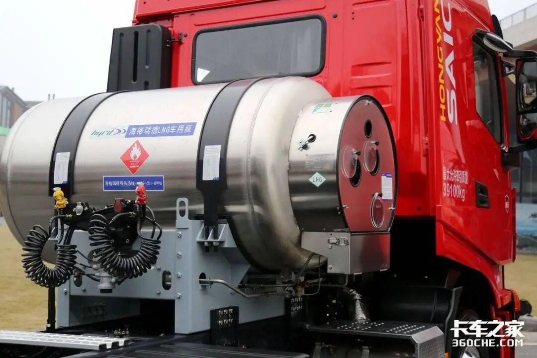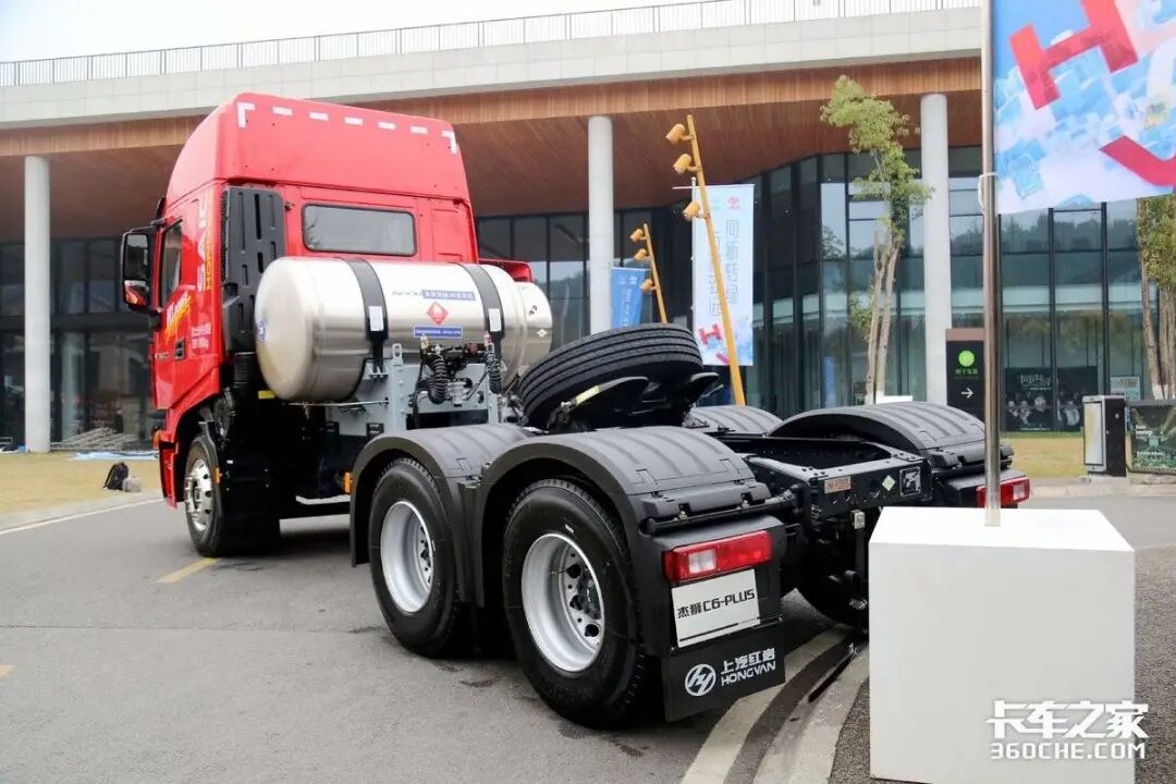 杰狮C6-PLUS 6×4 LNG牵引车的15L产品标配有1350L气瓶,可充装约449千克液化天然气,续航约1500公里。并且该车支持选装1500L气瓶,进一步延长车辆的续航表现。