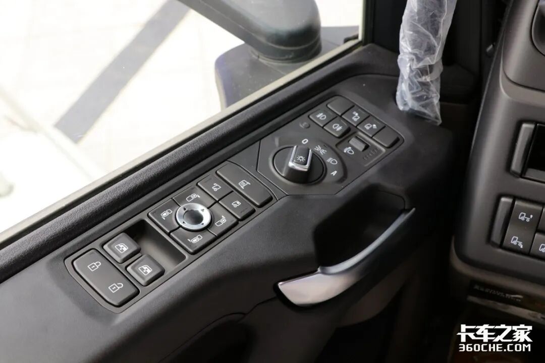车门上的按键排布密集,集成了大量功能,包含了后视镜调节、大灯高度调节、大灯开关、后视镜加热、射灯开关、中控锁、升窗按键。第一次驾驶斯堪尼亚的卡友需要好好适应一下,不过这样的设计集成化程度很高,稍微适应一段时间就会觉得这种触手可及的按键非常便捷。