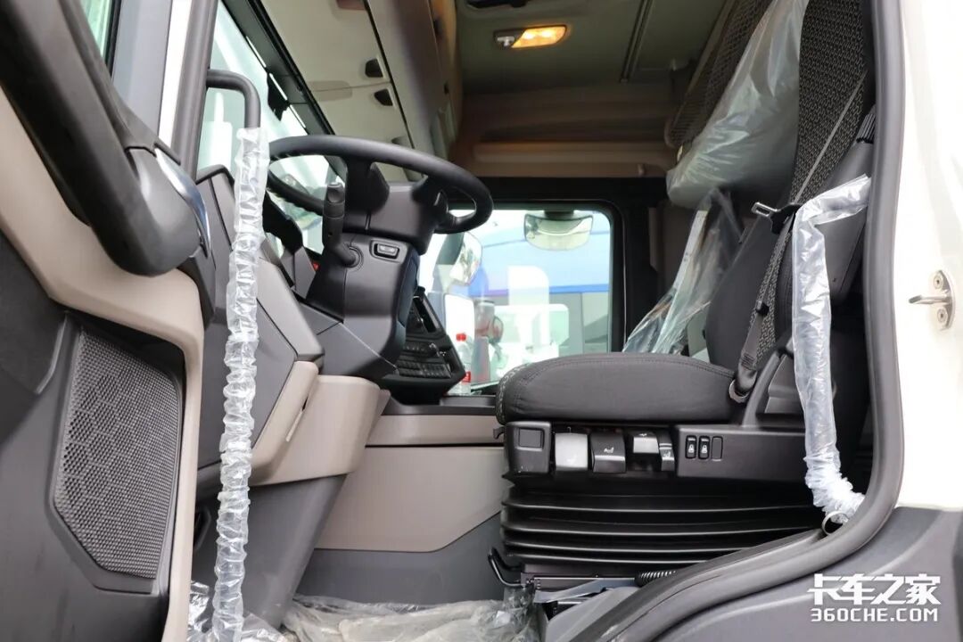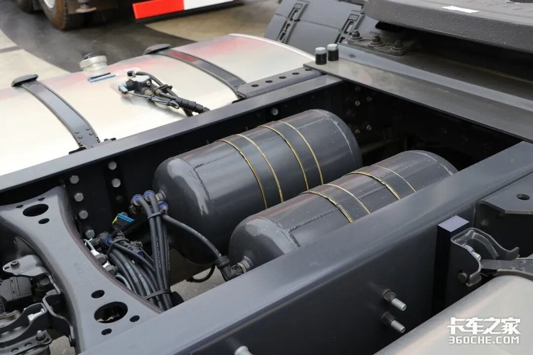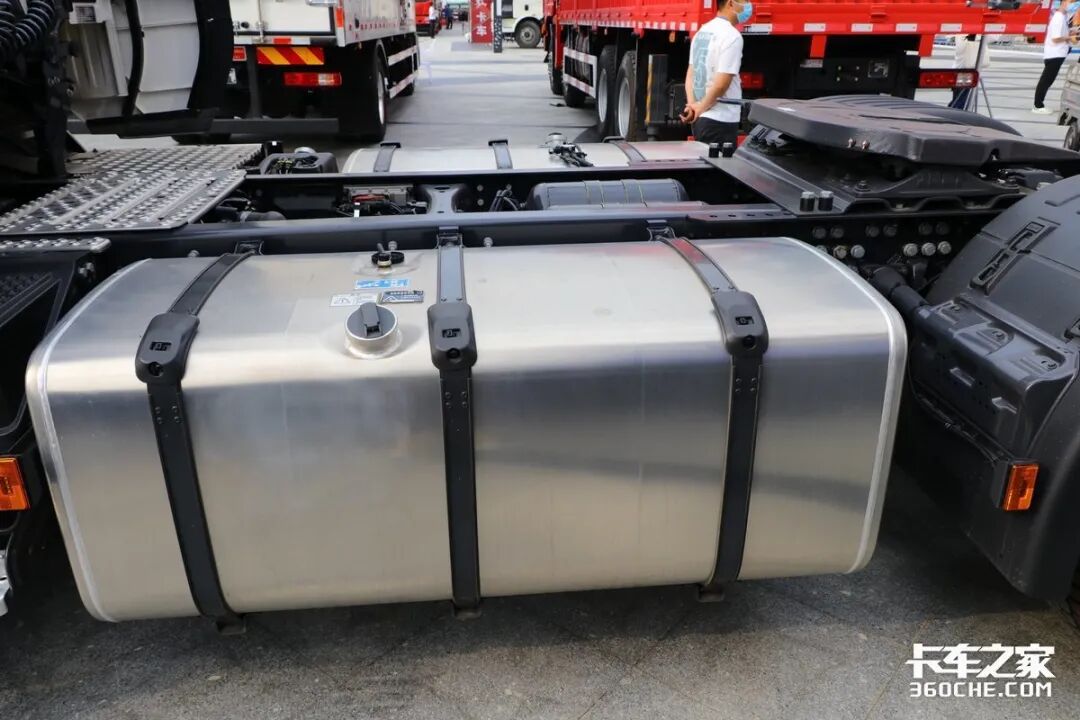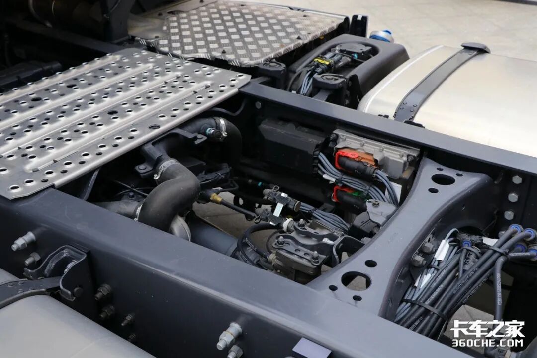 得益于优秀的底盘工艺,这台G系列将储气筒放置在了大梁车架内部,这样可以得到更夸张的油箱容积。实拍车型的油箱达到了1300升,对于一台4X2的牵引车来说,在标载运输的情况下,这台G410的续航里程可以突破4000km,非常夸张。