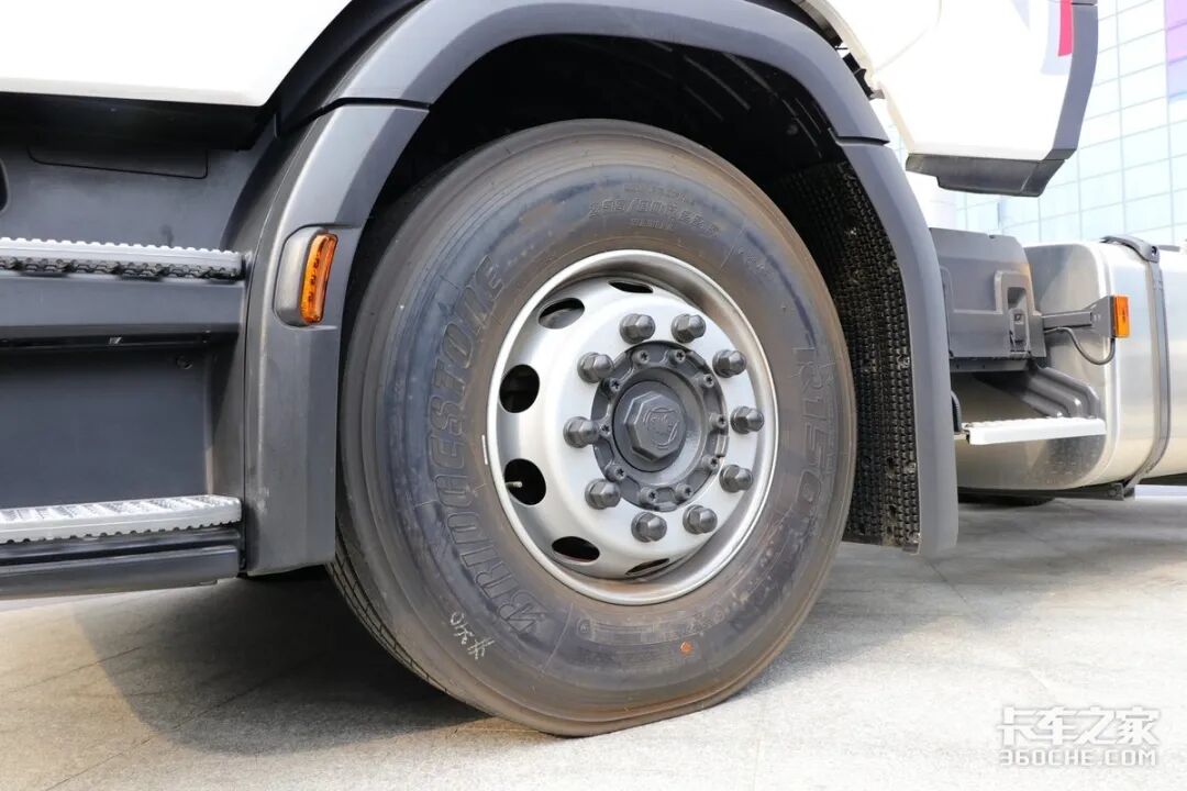 实拍车型采用了普利司通的R150系列轮胎,这是一款低断面轮胎,抓地性能较好,即便是在疏松的雪地上也有不错的性能表现,轮胎尺寸为295 80R22.5。前后桥均采用了盘式制动的设计,相比鼓式制动,在标载情况下,盘式制动拥有更加线性的刹车脚感以及更强的抗热衰减性,即便是连续的下坡也能更加从容应对。