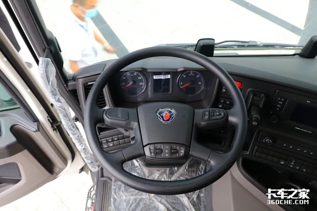 打开车门,首先我们可以看到,斯堪尼亚G系列拥有非常夸张的方向盘调节角度,第一个好处就是能够让各种身材的卡友都能找到适合自己的方向盘角度。第二个好处则是可以让一些身材魁梧的卡友上下车更加便捷,并且斯堪尼亚采用了织布材质的气囊座椅,冬暖夏凉,并且坐垫可以根据腿长进行前后调整,长途驾驶更惬意。
