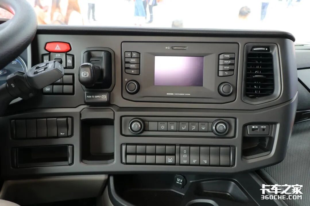 在中控方面,断气刹依旧布局在中控面板上,使用时更加顺手。而中控屏幕则采用了较小的设计,提供了收音机、多媒体、蓝牙电话等功能,当然也可以选装更大尺寸的屏幕,这样也可以将360环影和盲区监测加入其中。为什么说斯堪尼亚注重细节,在所有置物格中均布置了软垫设计,一是可以防滑,二是在颠簸路段下减少车内异响。