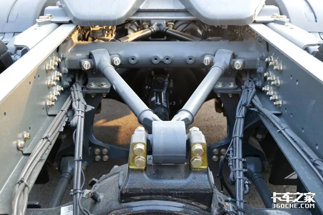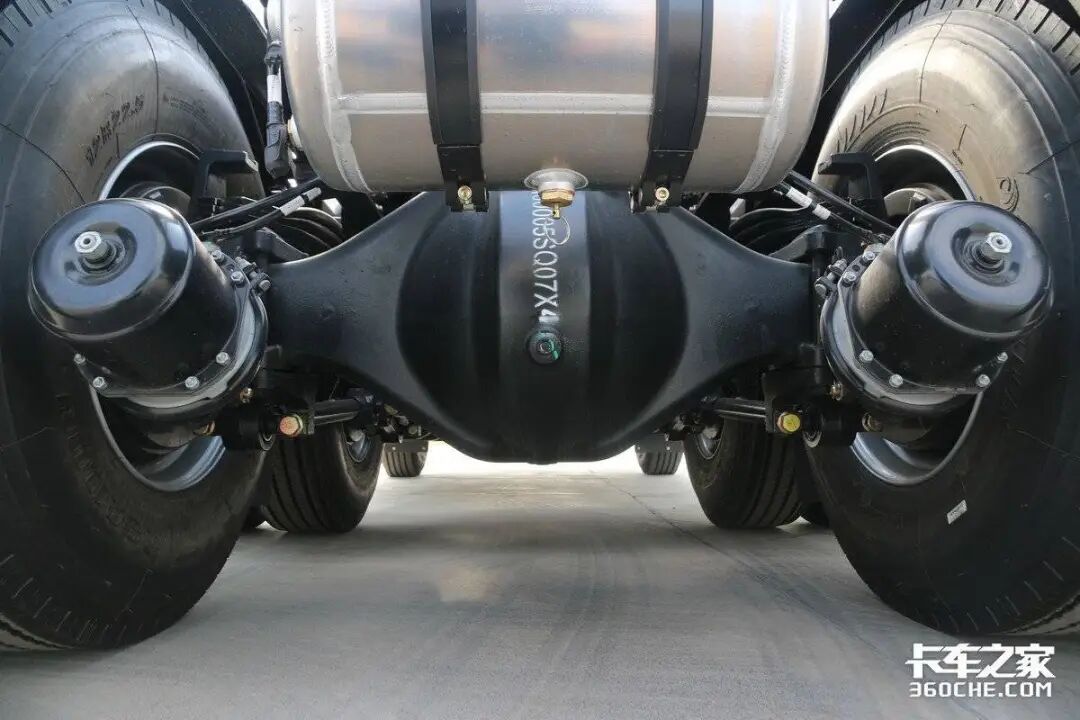 底盘配置方面,实车后桥搭载方盛440后桥,30万公里免维护,车辆管线紧凑整齐,管路相接的地方都配备有防磨损保护,车辆另外采用了铝合金尾梁,前二后三的板簧,铝合金钢圈,800L铝合金油箱等设计,实现了整车降重近400公斤,带液缓的车辆自重仅为8.5吨。