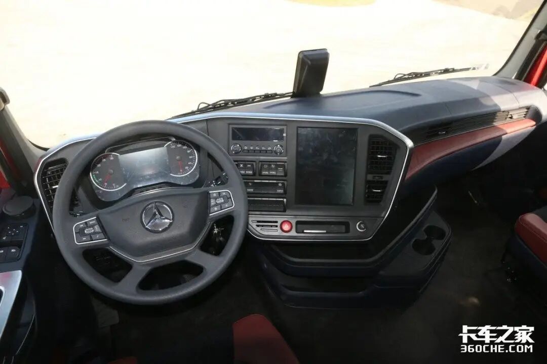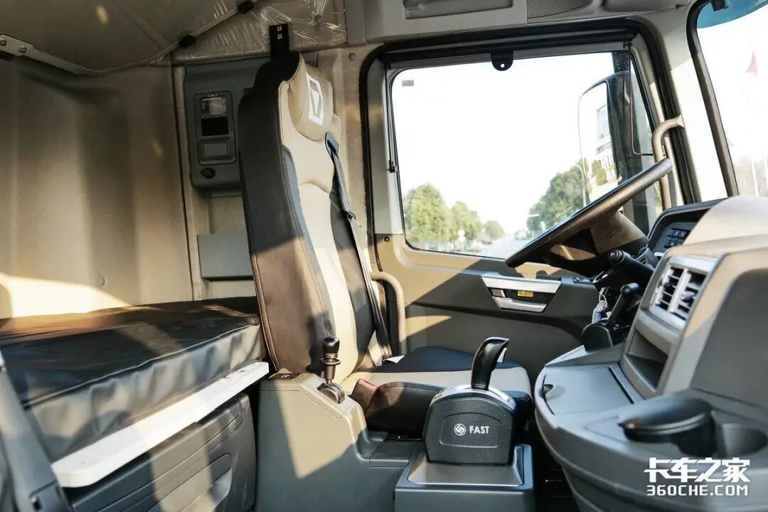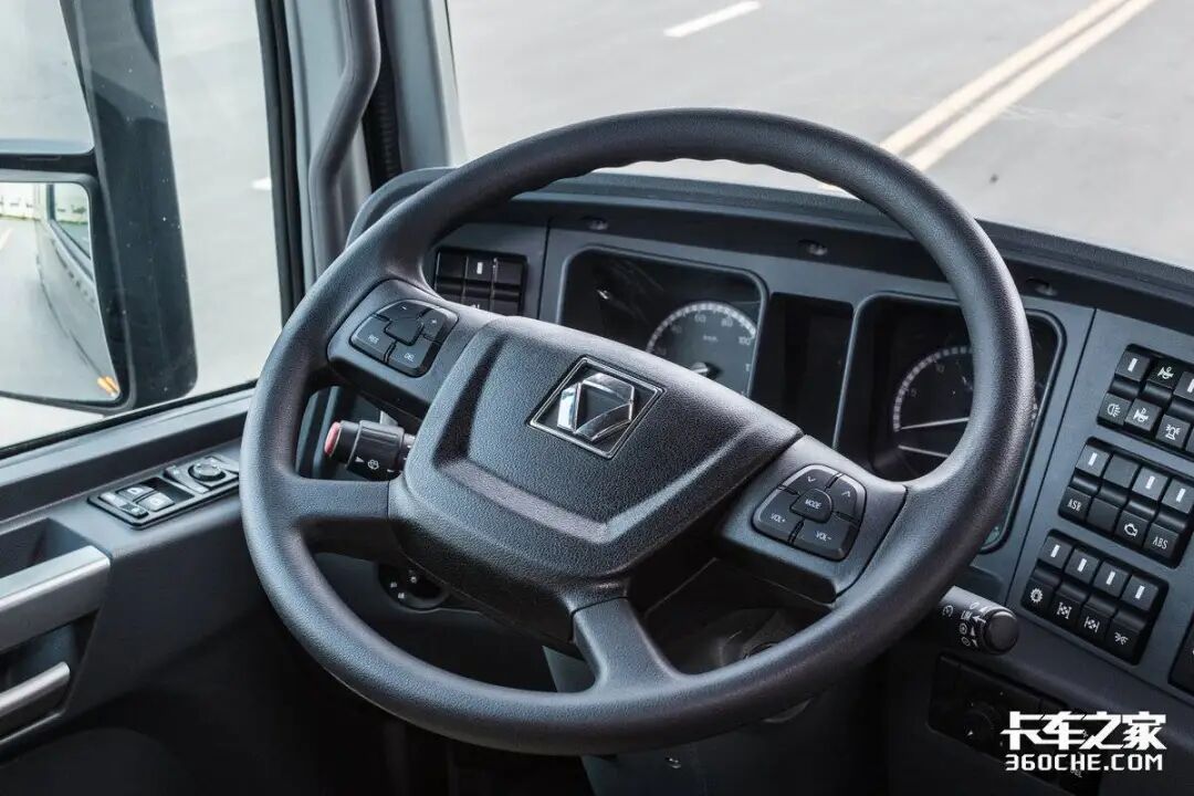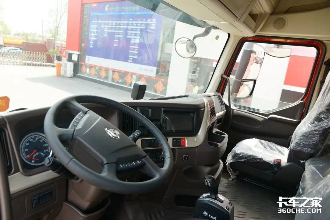 驾驶室方面,实车采用高顶宽体纯平地板驾驶室,空间十分充裕;车辆配置有气囊减震座椅、多功能方向盘、中控大屏、1000L储物柜、小桌板、驻车空调、液力缓速器、胎压监测等等诸多旗舰级配置,可谓是该有的一个也不少。