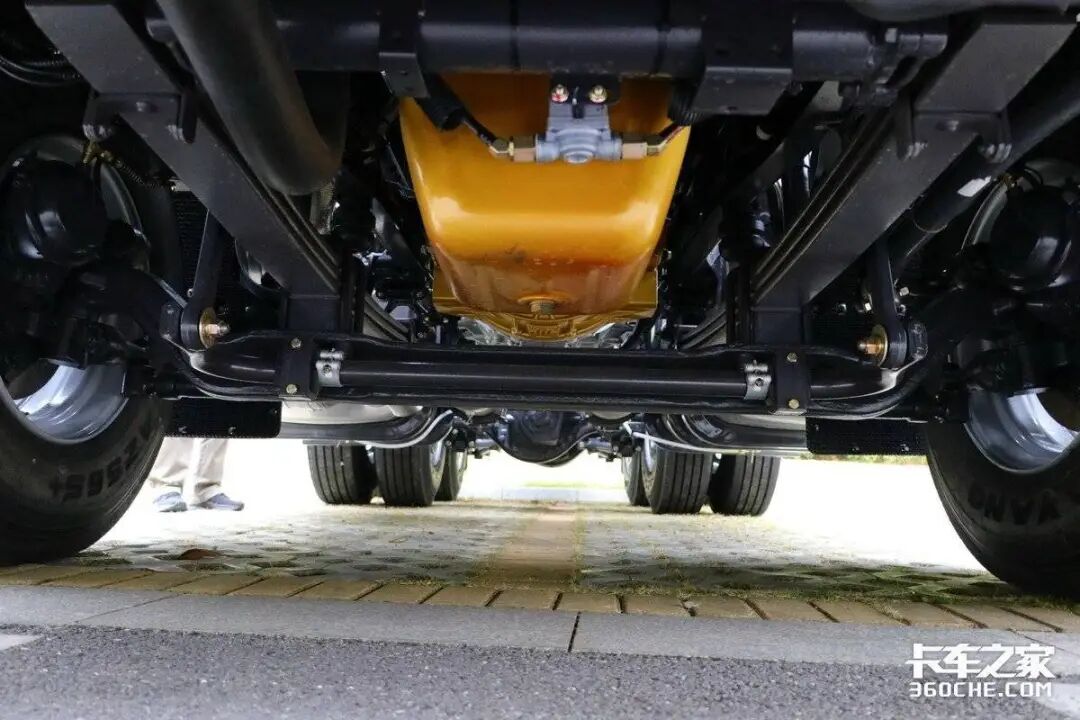 在底盘方面,实车的后桥采用汉德425桥,轻量化一体式铸造,后桥速比为3.7。悬架方面,实车采用的是前2后3的少片簧设计,能够兼顾承载性能的同时,进一步降低整车自重,整车自重仅为8.52吨。
