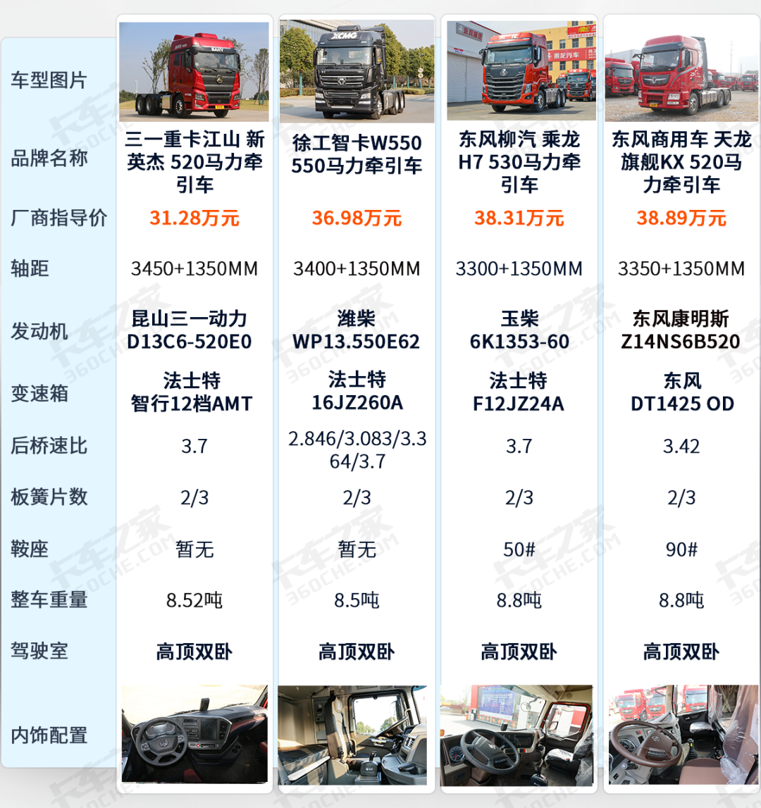首先,小编先为大家推荐一款号称“性价比杀手”的三一重卡旗下的三一重卡江山新英杰 520马力牵引车,该款车型采用了新一代道依茨13L发动机,520马力最大扭矩2550N.m,匹配了法士特智行12档AMT变速箱以及汉德425车桥,质量稳定同时兼顾轻量化,整车售价仅需30万元左右即可入手。