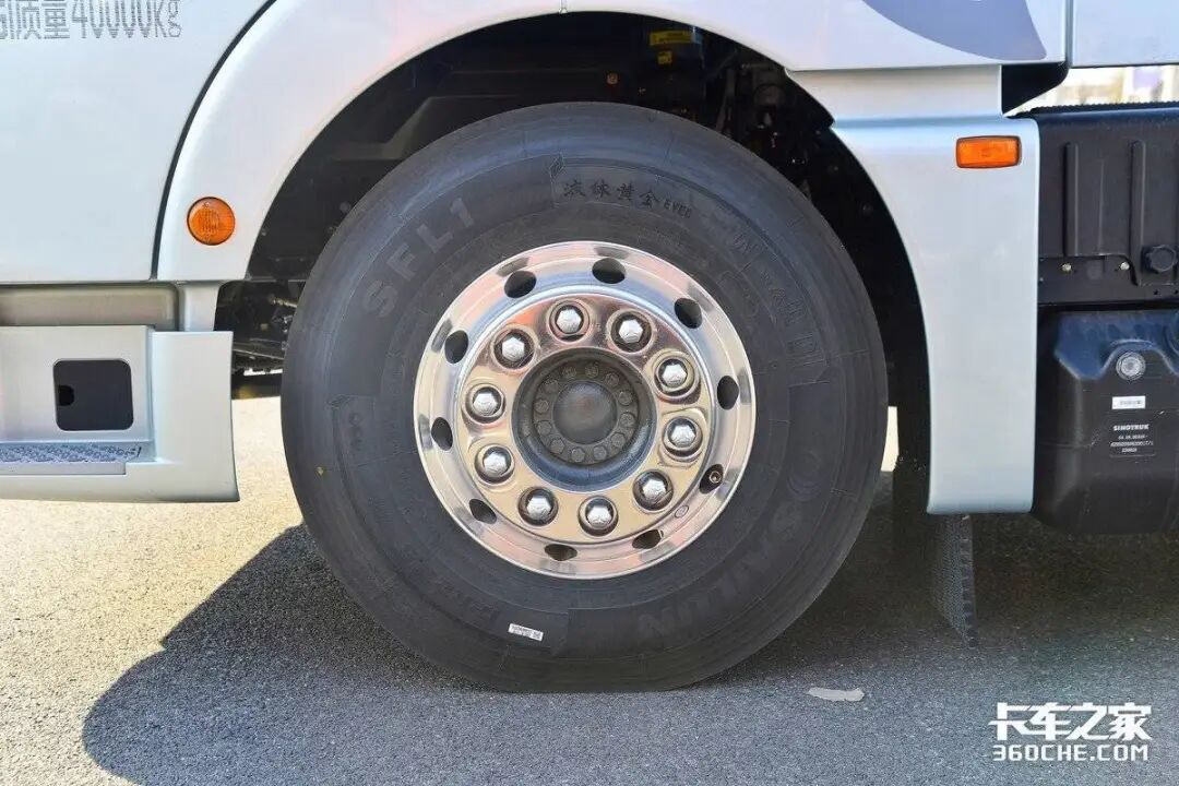 实拍的汕德卡G7H前轮采用了铝合金轮圈来优化自重,实拍车应用了赛轮低滚阻节能轮胎,其规格为12R22.5,该轮胎上印有“液体黄金”的字样,不但拥有超强的耐磨性能,还具备行驶噪音低的特点。