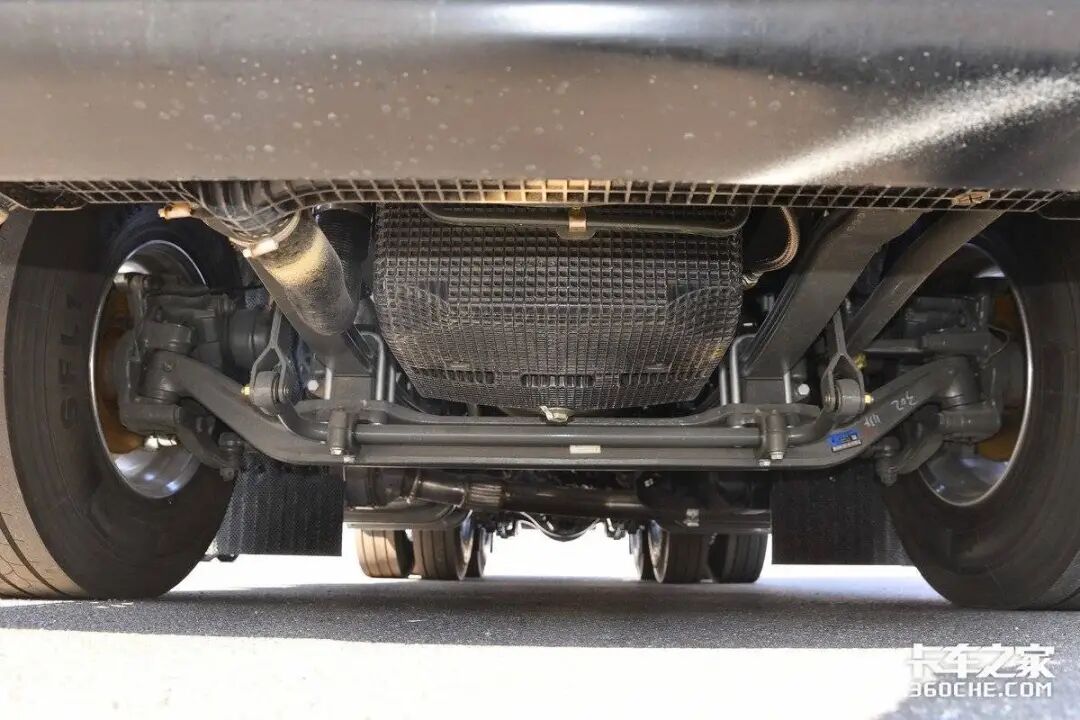 来到底盘左侧,我们可以观察到G7H的电池组与尿素箱采用了叠放布局,是近来兴起的较为高效的布置方式。这种布置有着显而易见的两方面优势,一来是缩小了模块间纵向布置的间隙,二来则是降低了尿素箱加注口的高度,使得加注过程更为轻松。