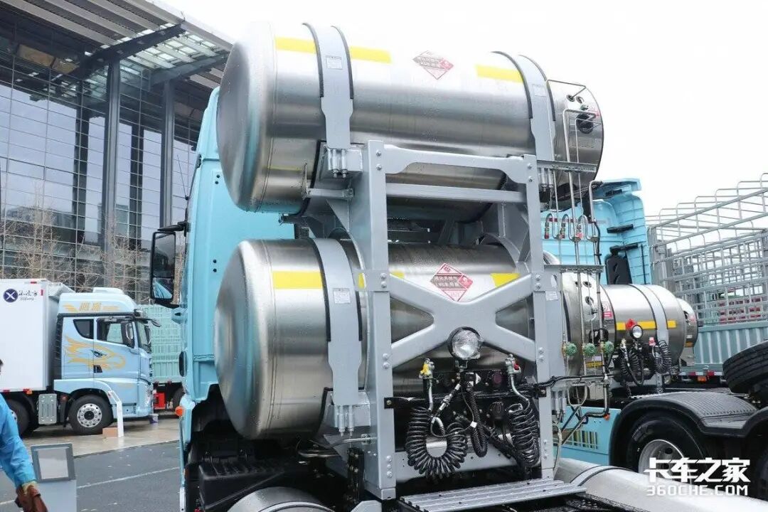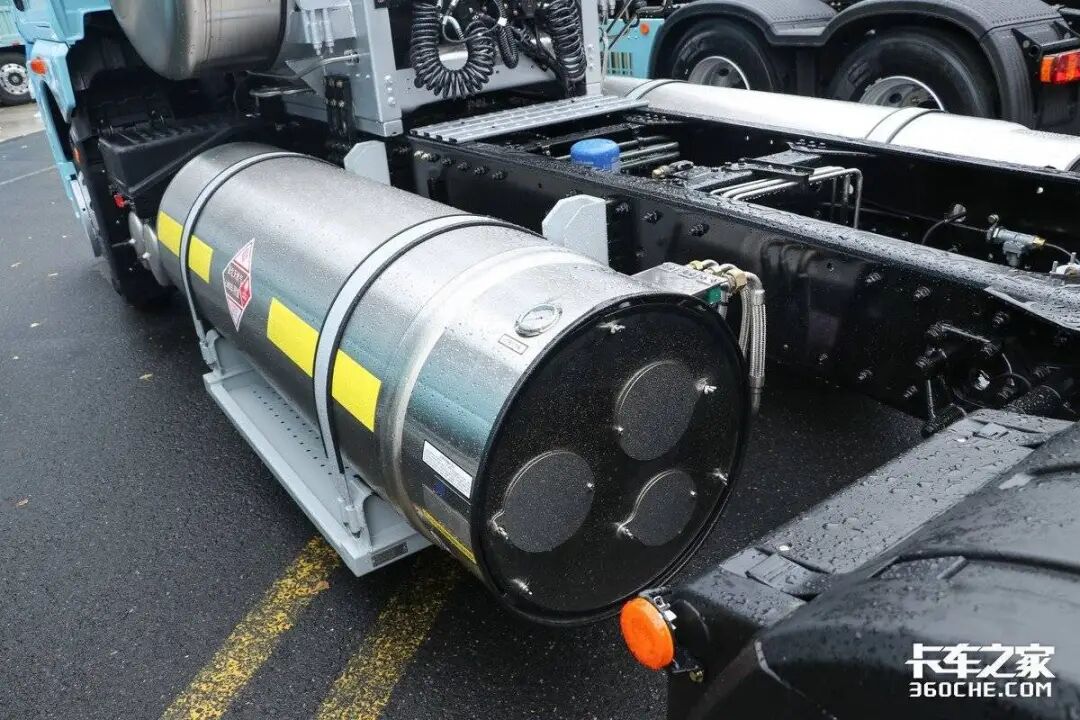 续航能力上,可以看到该车LNG气瓶数量极其夸张,除了驾驶室后“背”了两个大气瓶之外,在车身两侧竟还侧挂有两个气瓶,其总容积高达3800L,就算有较长距离运输需求,在加满气后也能够一次性跑到目的地,运营效率更高。