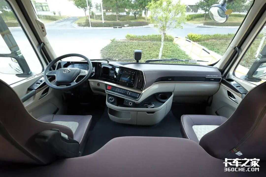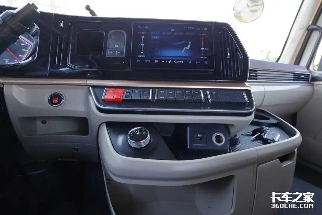 实车中控采用环抱式设计,偏向驾驶员一侧操纵中控更加方便,拼色设计也会带来更强的视觉冲击感,配置方面,该车布置有旋钮式换挡机构、电子手刹、10.1英寸中控大屏、自动空调、90厘米卧铺、抽拉式小桌板、640L超大储物空间等。另外,这款乘龙H5V还支持一键启动+远程智能控制(远程启动空调、门窗、灯光)功能,能够大大提升车辆的人机交互体验。