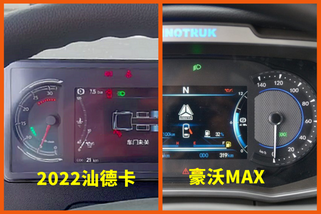 内饰部分,新款汕德卡换装了与豪沃MAX相同的半液晶仪表,为什么是半液晶仪表,因为除了中央的屏幕之外,两侧的转速表和时速表仍为机械指针,且布局与豪沃MAX的仪表基本相同,只是在仪表纸的颜色上进行了更换。