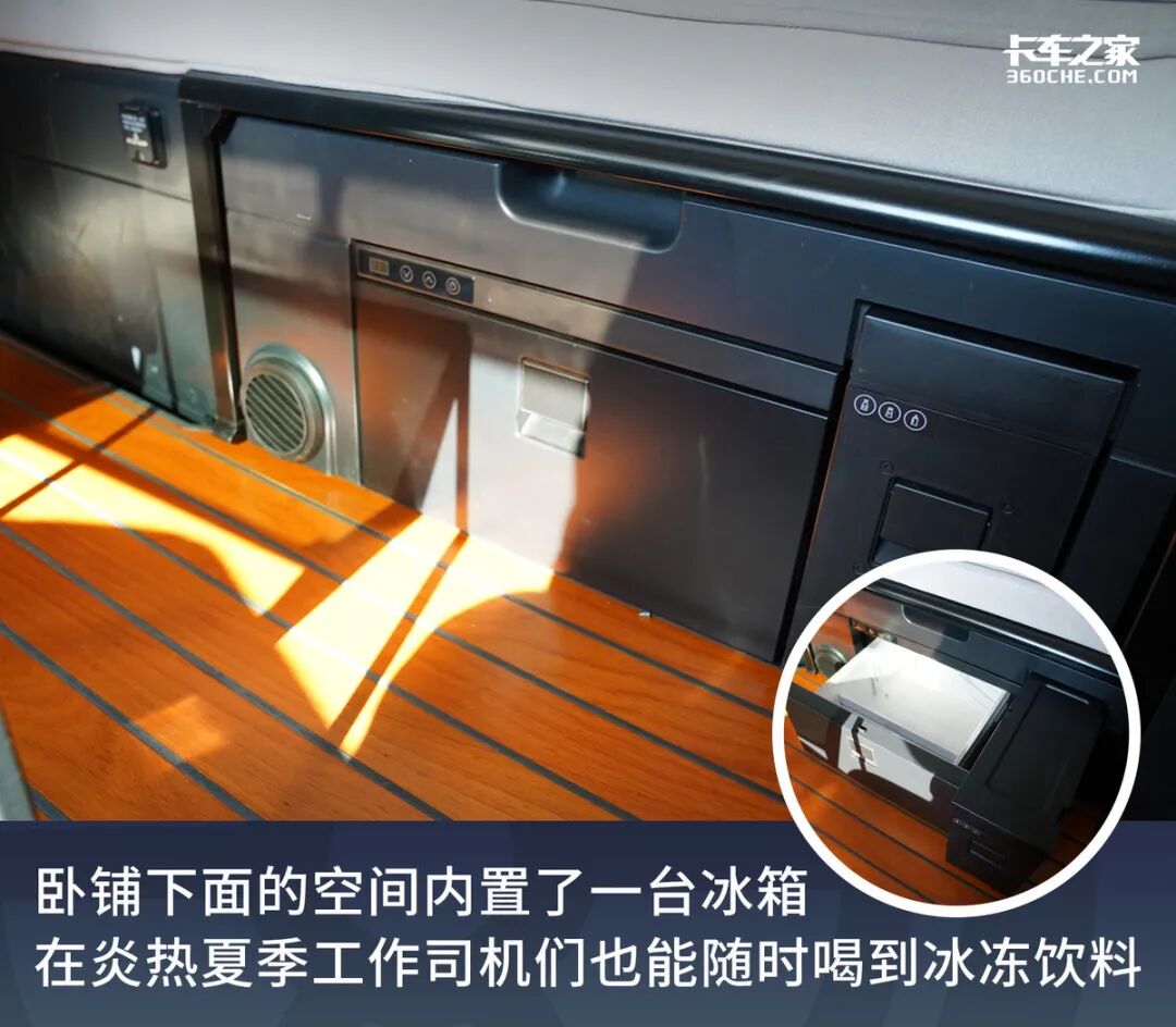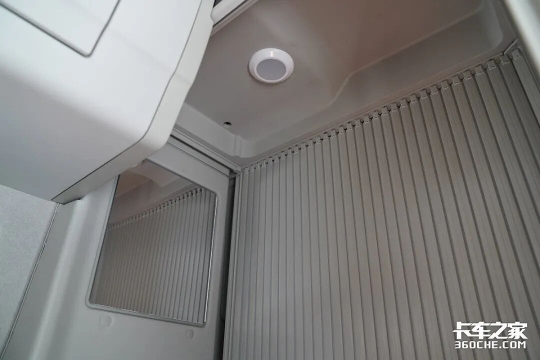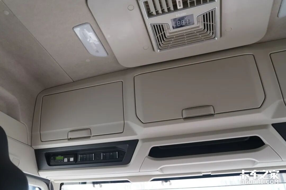 得益于高大的驾驶室尺寸,车内的顶置储物格容量可观,位置合理不会有碰头烦恼。正上方是驻车空调,无论着车还是熄火时,都能为驾驶室保持舒适温度。