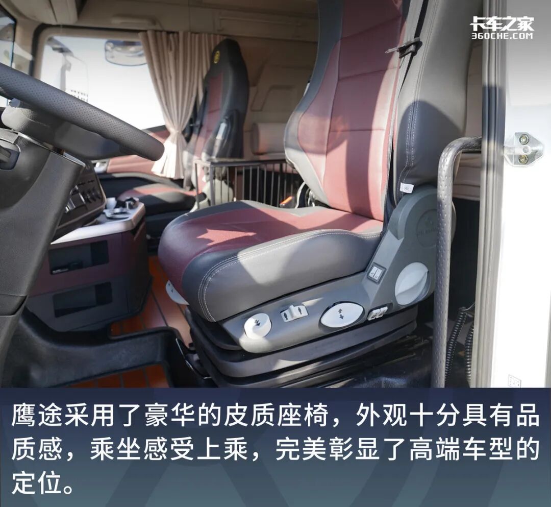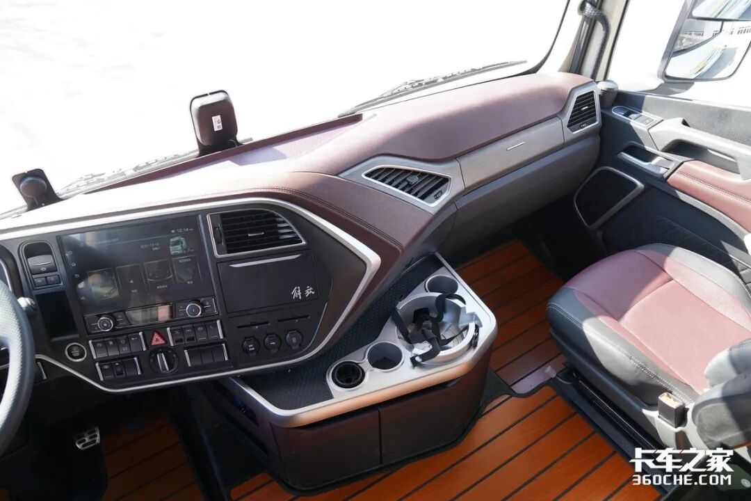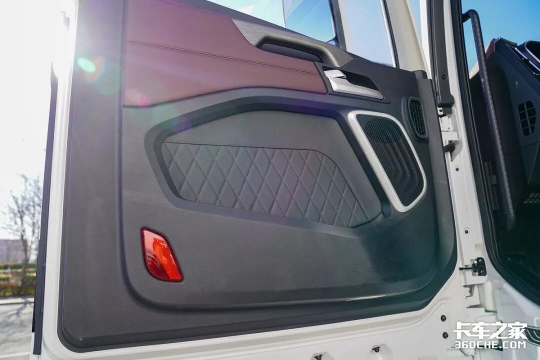车内最先映入眼帘的是格拉默的MSG115全皮质座椅,腰部具有支撑系统,能加大弯道驾驶时座椅对驾驶员腰部两侧的有力支撑,还支持靠背调节、倾角调节、快降、阻尼调节等功能,在许多旗舰级重卡上都能见到它。