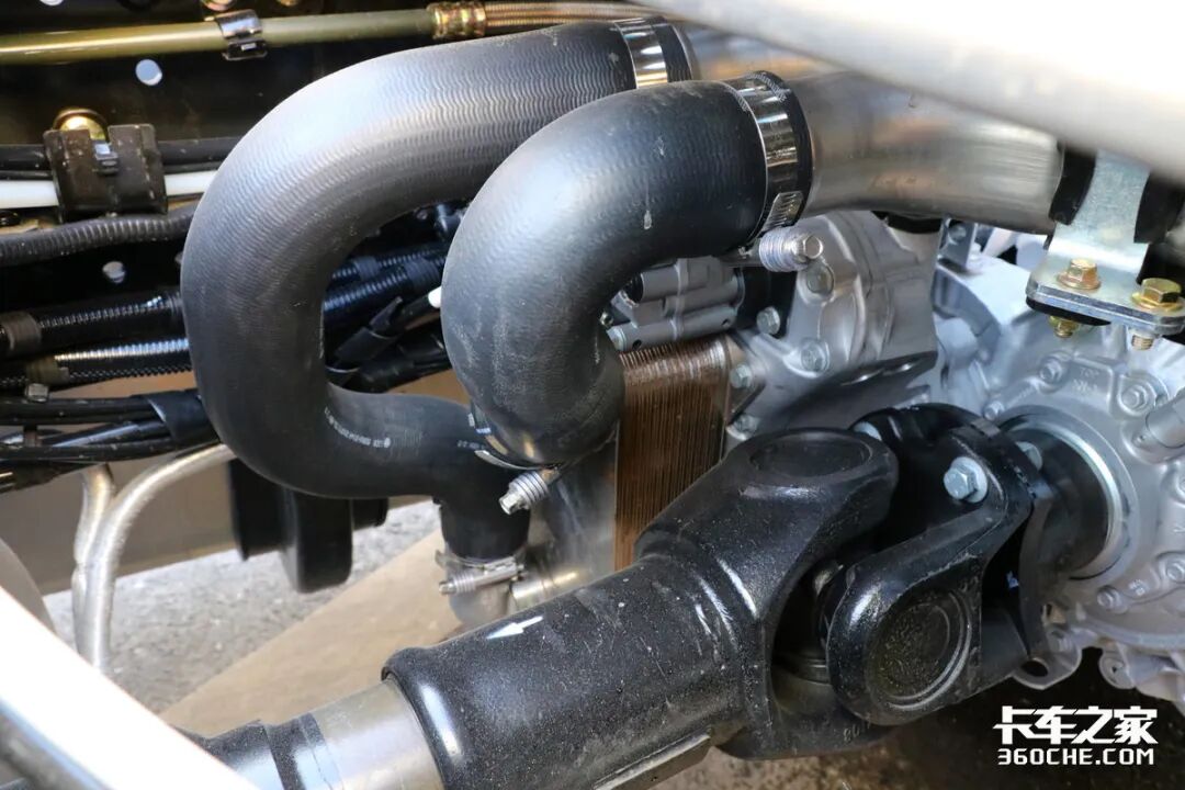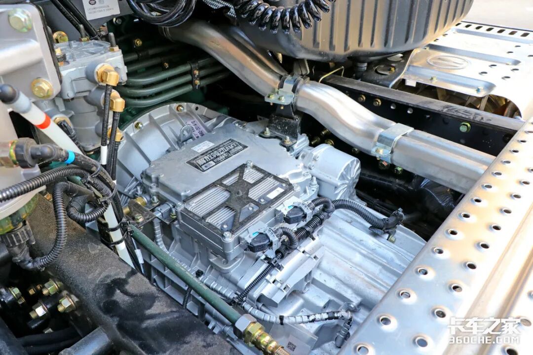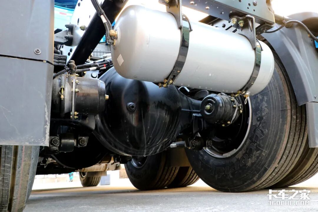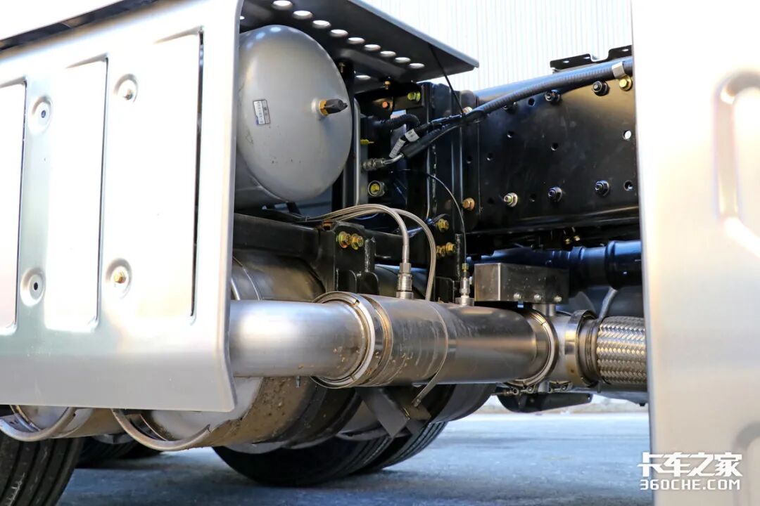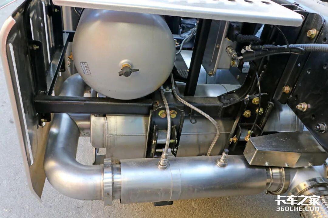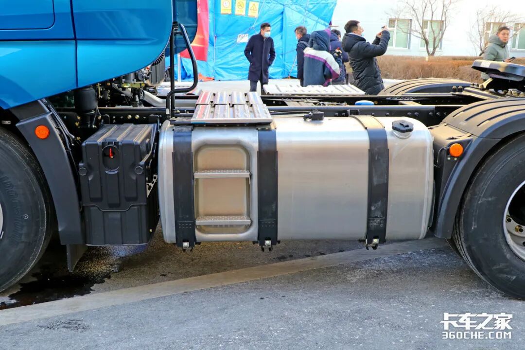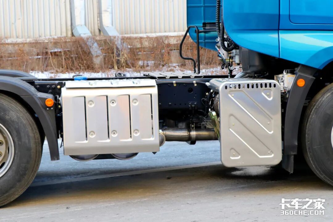 在车辆底盘左侧,可以看到双电瓶采用竖置布局,旁边则是700升容积的铝合金油箱,能够为车辆提供超过2100公里的续航里程。而且车辆所匹配的氨罐也是配合车辆续航所使用的。