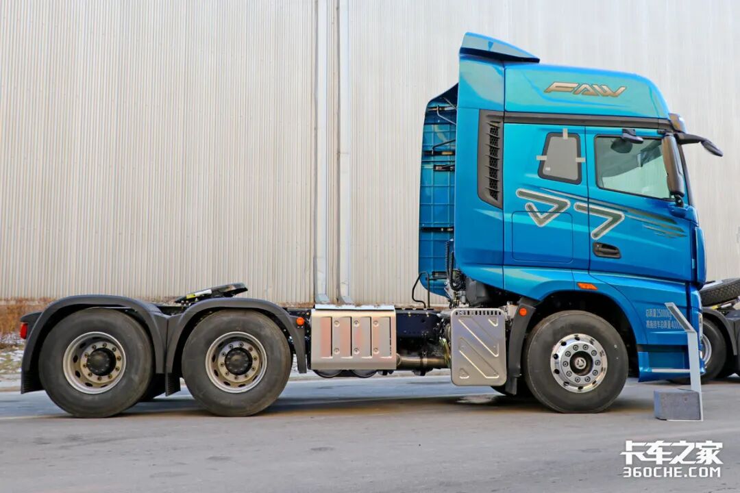 本文实拍的解放J7车型最大的改变就是搭载了固态氨后处理技术,可以看到车辆右侧底盘布置有两个“铁盒子”,前部为集成式后处理,后部为氨罐和储气罐集成式设计,为了更好的保护氨罐,外部还带有铁皮包裹。