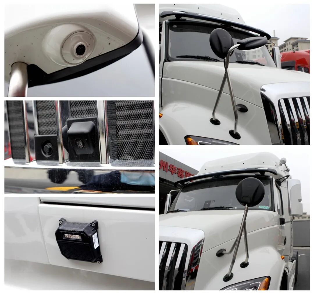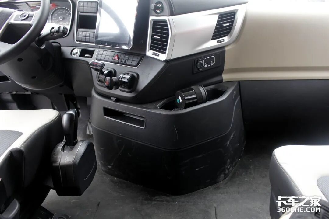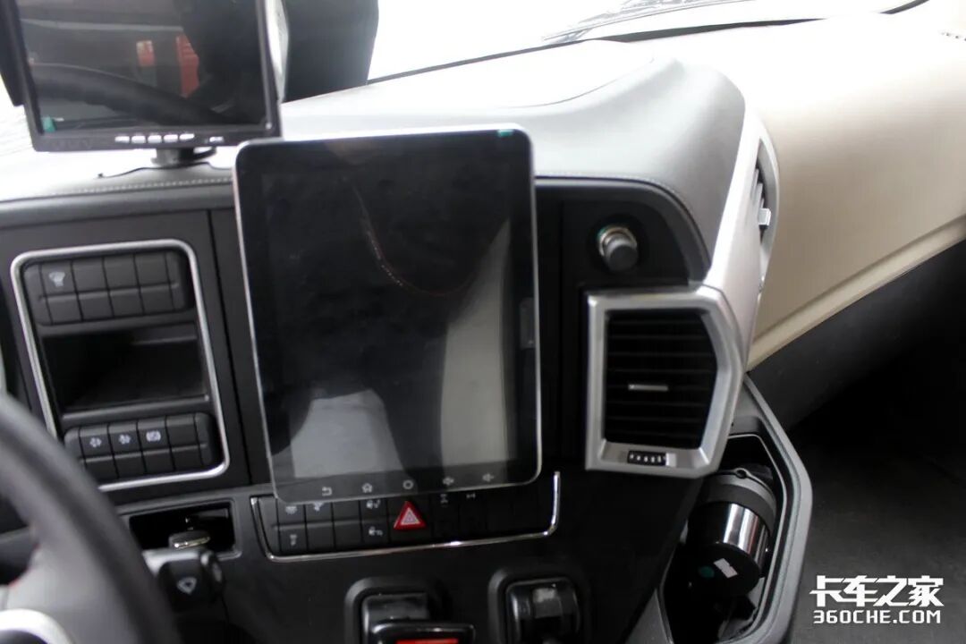 车头虽然长而大,但得益于硬件配置和科技手段的配合,其实在车内能够掌握所有的盲区信息。两侧用金属管子直接支棱起来的补盲镜,非常粗暴实在;车头中网和一体式后视镜下部的摄像头,组成了360度环视的前方和侧方视角,在这些配置的配合下,在驾驶室内你会有一种非常通透的驾驶感。