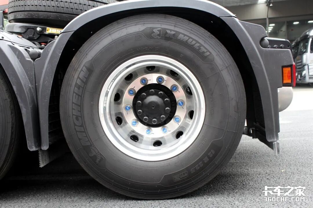 配备规格为12R22.5的米其林低滚阻轮胎,加上特殊的公路花纹设计,可以有效降低与路面摩擦系数,也具有一定的节油效果。另外,该车可选米其林315/70R22.8的真空胎。