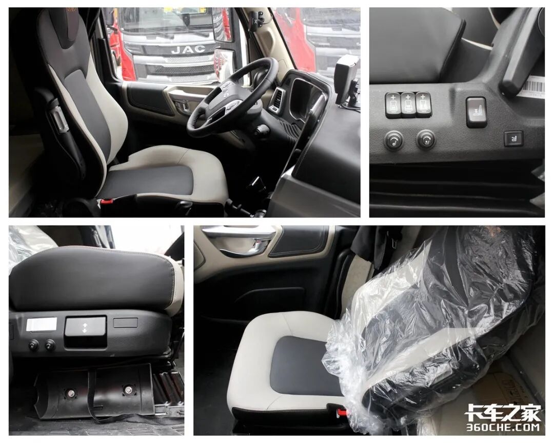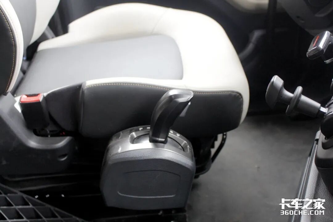 主驾座椅比较有意思的是,右侧硬链接挂有AMT操纵挡把,这种设计的好处是不管座椅大幅度升高还是前后移动,挡把并没有产生相对位移,高度和距离始终保持和驾驶员一致,操作起来更舒适。顺便提一下,江淮跨越V7全系都为AMT车型。